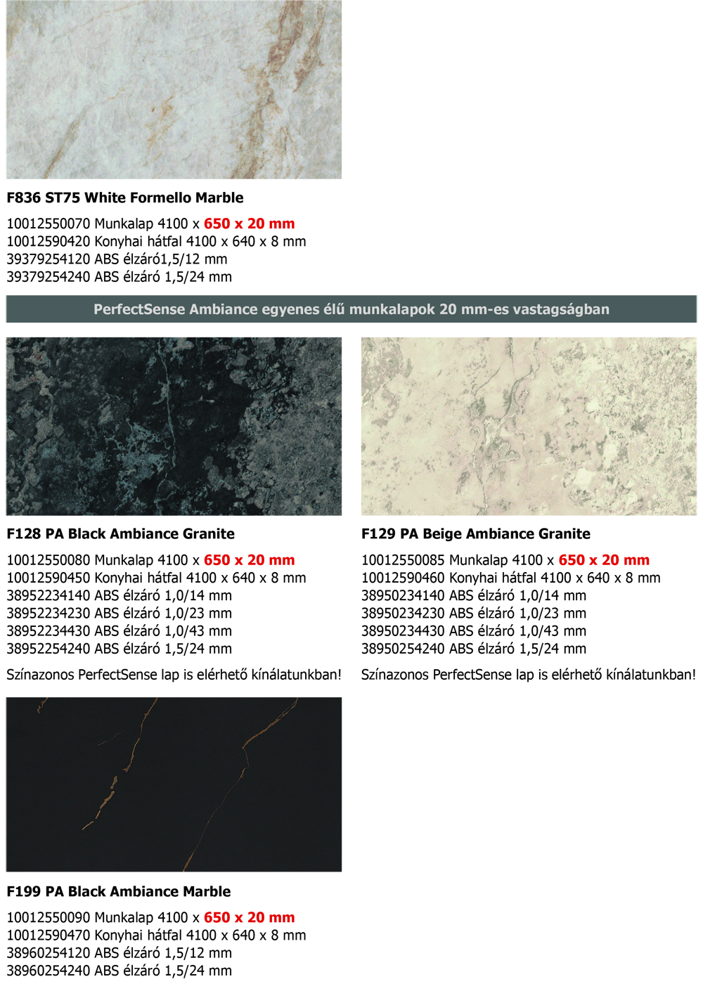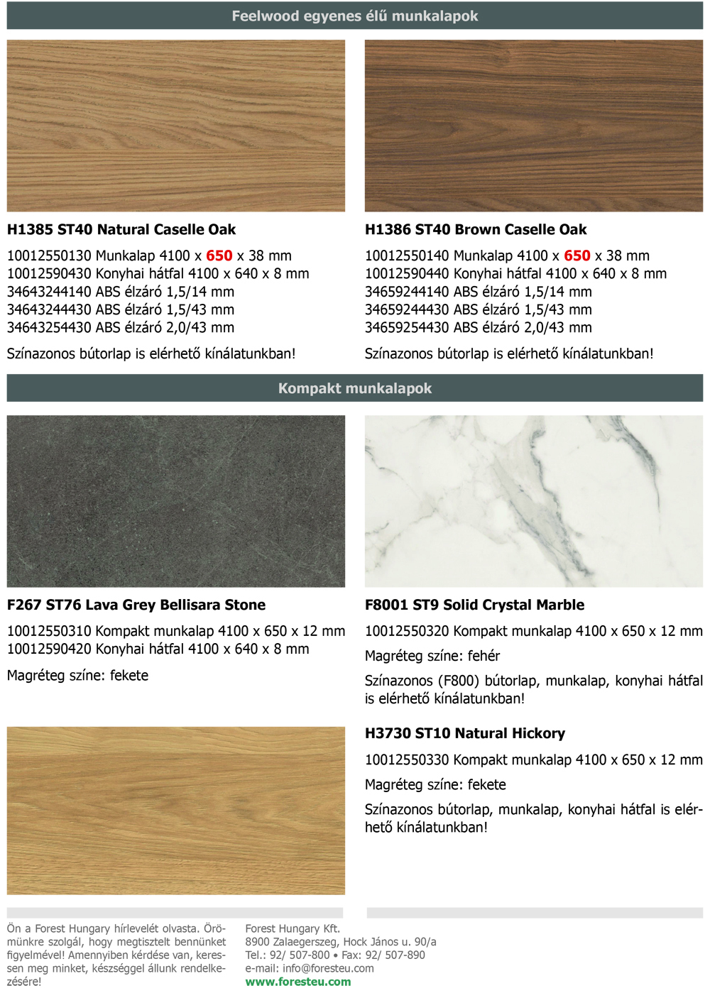 Újdonságként jelennek meg kínálatunkban az egyenes élű munkalapok 20 mm-es vastagságban, 650 mm mélységben, összesen hat dekorral (három PerfectSense Ambiance (F128 PA, F129 PA és F199 PA) és három klasszikus kőreprodukció). A jól ismert kompakt munkalapok választéka is három új dekorral bővült: F8001 ST Solid Marble Crystal, F267 ST76 Lava Grey Bellisara Stone és H3730 ST10 Natúr Hickory. Az új felületek minőséget és karakteres hatást nyújtanak. Ezen kívül a Feelwood egyenes élű munkalapok választékát az egyedülálló ST40 dekorokkal egészítettük ki, H1385 Casella Natúr Tölgy és H1386 Casella Barna Tölgy színekben (szintén 650 mm-es mélységben!). Ezek a dekorok a fa eredeti megjelenését és érzetét hozzák a belső terekbe, természetes, meleg, egyszerre időtlen és sokoldalú esztétikát teremtve. Minden új munkalaphoz színazonos konyhai hátfal is elérhető!