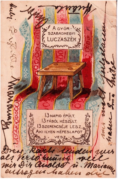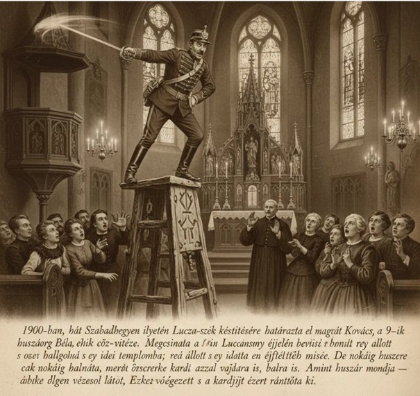 „Szabadhegyen ilyetén Lucza-szék készítésére határozta el magát Kovács Béla, a 9-ik huszár-ezred egyik köz-vitéze. Megcsinálta a Lucza-széket s karácsony éjjelén bevitte a templomba; reá állott s egy ideig azon hallgatta az éjféli misét. De nem sokáig hallgatta, mert egyszerre csak kirántotta a kardját s elkezdett azzal vagdalózni jobbra is, balra is.
