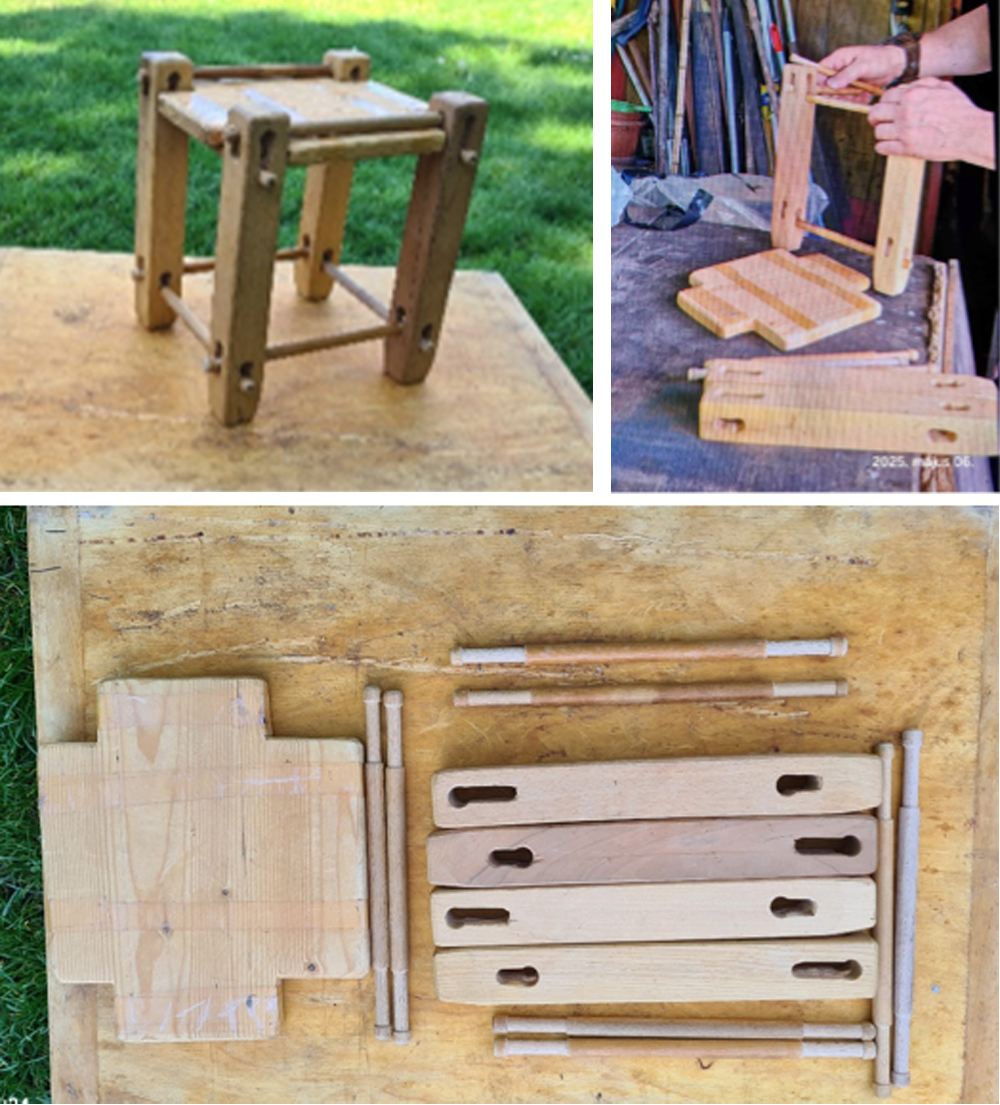 Kerling Alajos által készített Luca szék összeállított, készülő és szétszedett állapotban